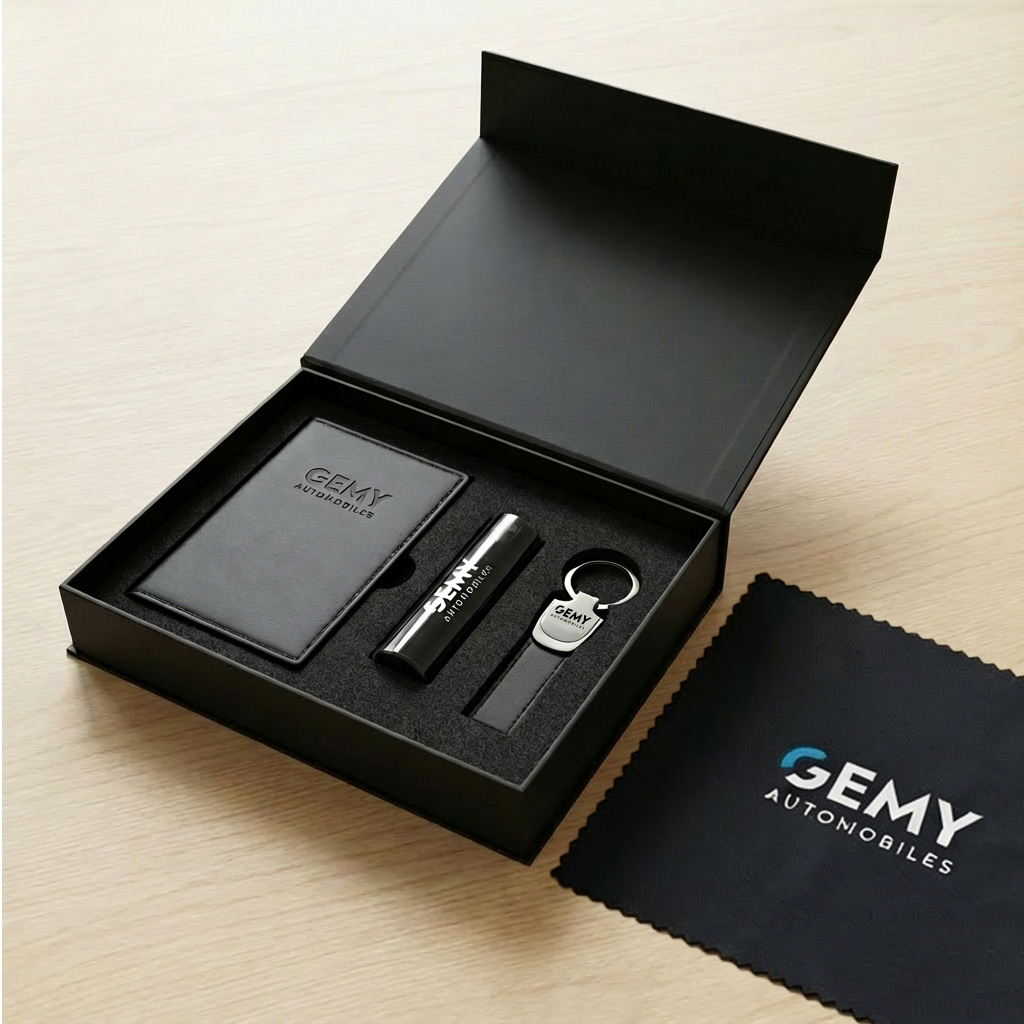 Coffret aimanté noir avec logo GEMY AUTOMOBILES sur le couvercle.