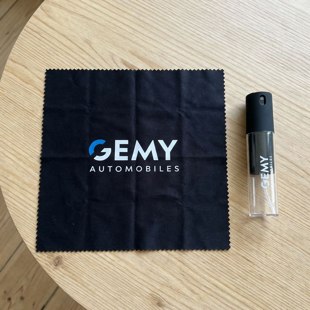 – 1 chiffonnette microfibre noire (20 x 20 cm) – Logo GEMY en 2 couleurs au recto